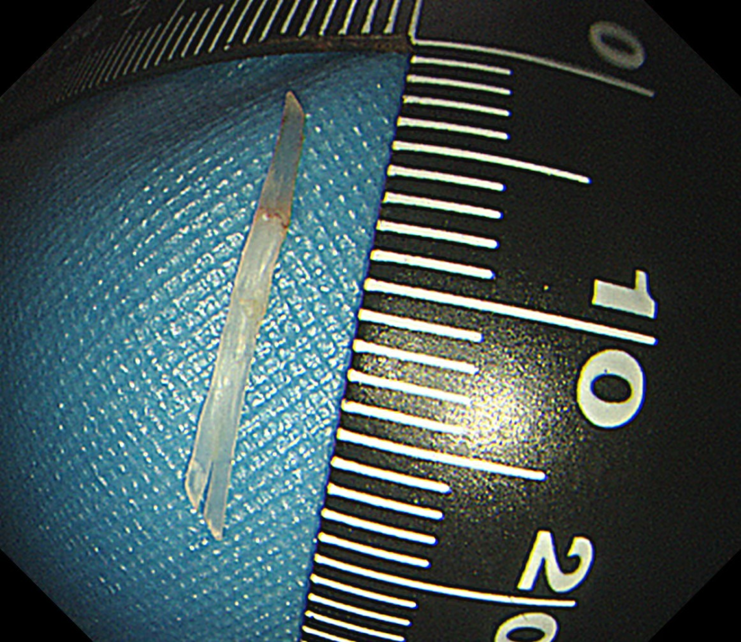 刘蔚轻夹鱼刺,慢慢提拉,生怕稍一用力刺破食管壁,这根长度1.5厘米的鱼刺,终于被成功取出,与CT报告完全吻合。