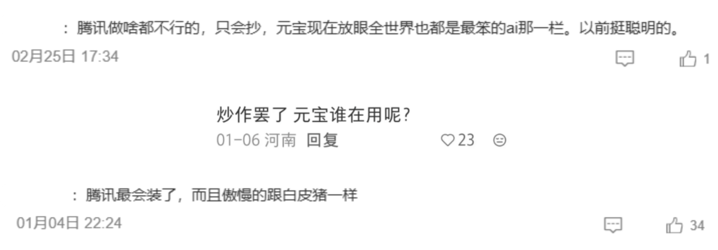 四是认为元宝产品存在技术漏洞和过度营销。部分舆论将AI不当言论归因于腾讯技术管控不足,认为所谓“系统失误”本质是品牌对产品质量的重视不足,将相关不满情绪进一步传导至母公司腾讯,引发公众对其在技术研发与内容审核环节专业性的质疑,不信任感由单一产品扩散至整体品牌,进一步放大舆情负面影响。