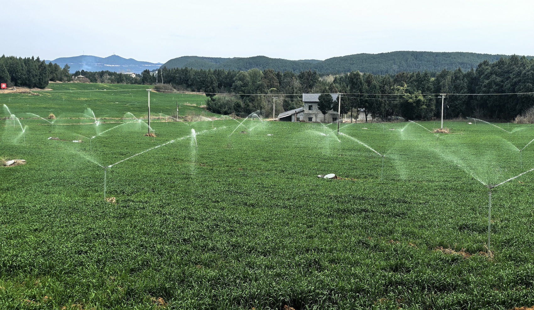 3月9日,在绵阳市盐亭县鹅溪镇的生猪种养循环现代农业园区,放眼望去,连片的冬小麦织就一张硕大的绿毯。田垄间,一套智能喷灌系统正根据实时监测的土壤墒情精准作业,细密的水雾均匀洒落在拔节孕穗的麦苗上,为这片希望田野送上了一场及时的“数字春雨”。