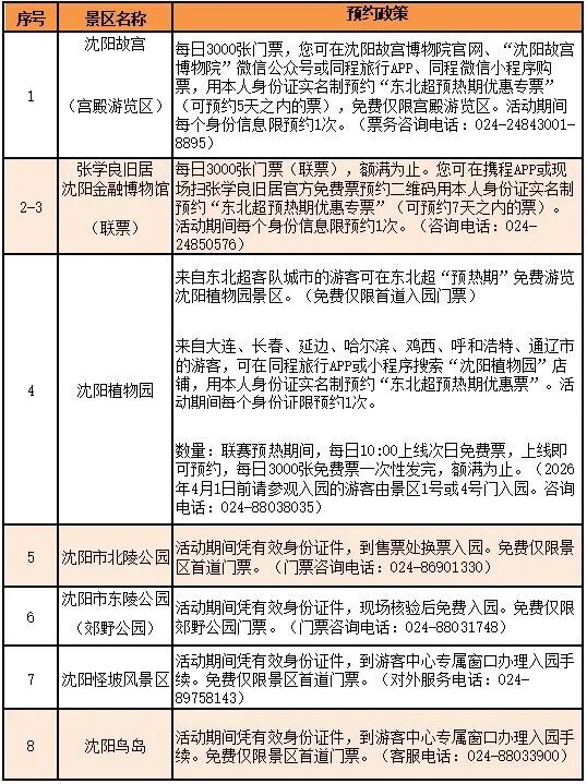5月“东北超”足球联赛战鼓即将擂响,大东北足球热情将全面点燃!作为联赛开幕式主场,沈阳带着满格热情提前宠客——3月11日至4月30日,大连、长春、延边、哈尔滨、鸡西、呼和浩特、通辽的老铁们,凭本人有效身份证件,就能免费畅游沈阳八大景区!这波诚意福利拉满,邀请各兄弟城市朋友们共赴这场春天的约会!