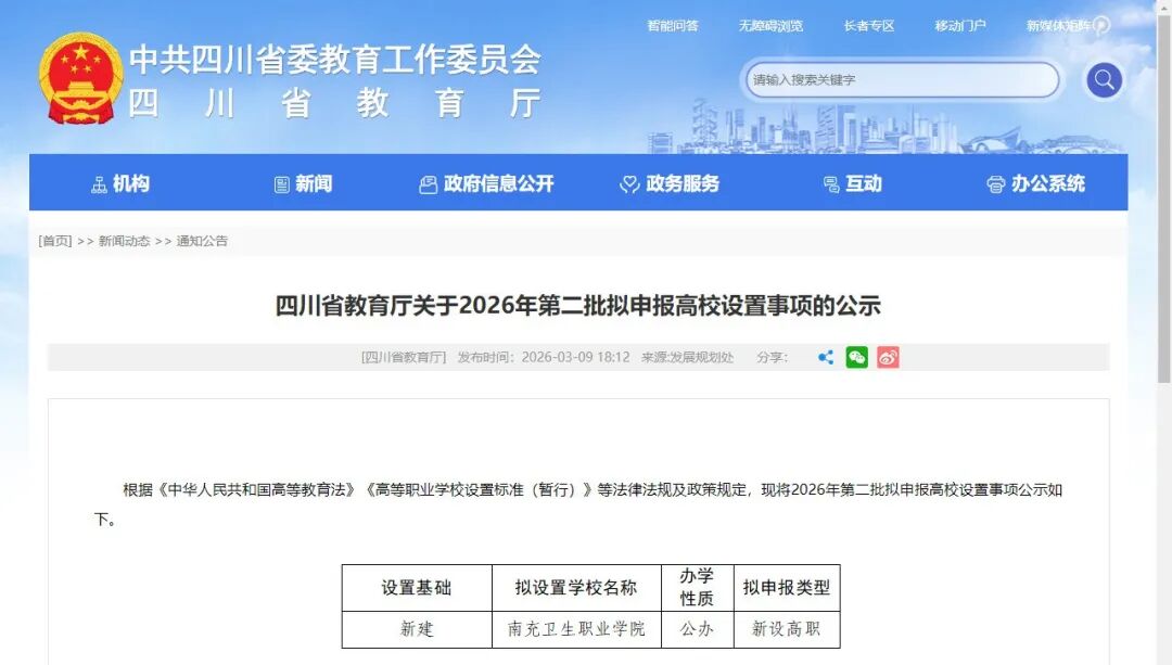 根据《中华人民共和国高等教育法》《高等职业学校设置标准(暂行)》等法律法规及政策规定,现将2026年第二批拟申报高校设置事项公示如下。