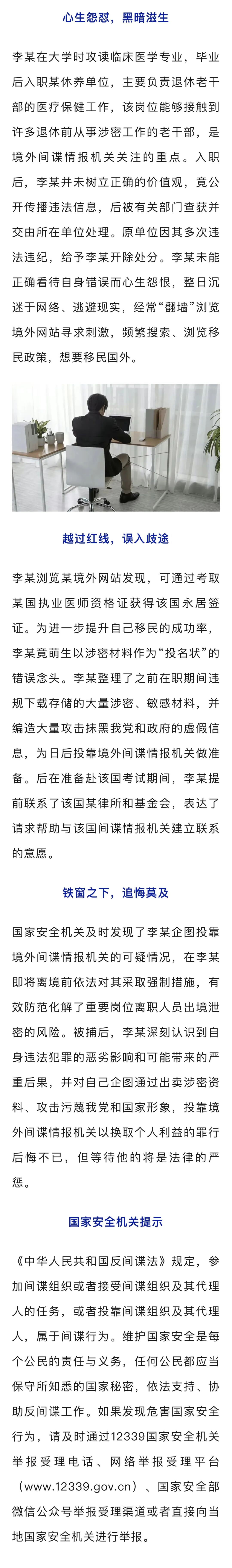 “我真的是一时糊涂啊,行差踏错,说什么都来不及了……”在面对国家安全机关工作人员的询问时,李某懊悔地说道。近期,国家安全机关破获了一起某重要岗位离职人员主动投靠境外间谍情报机关的案件。