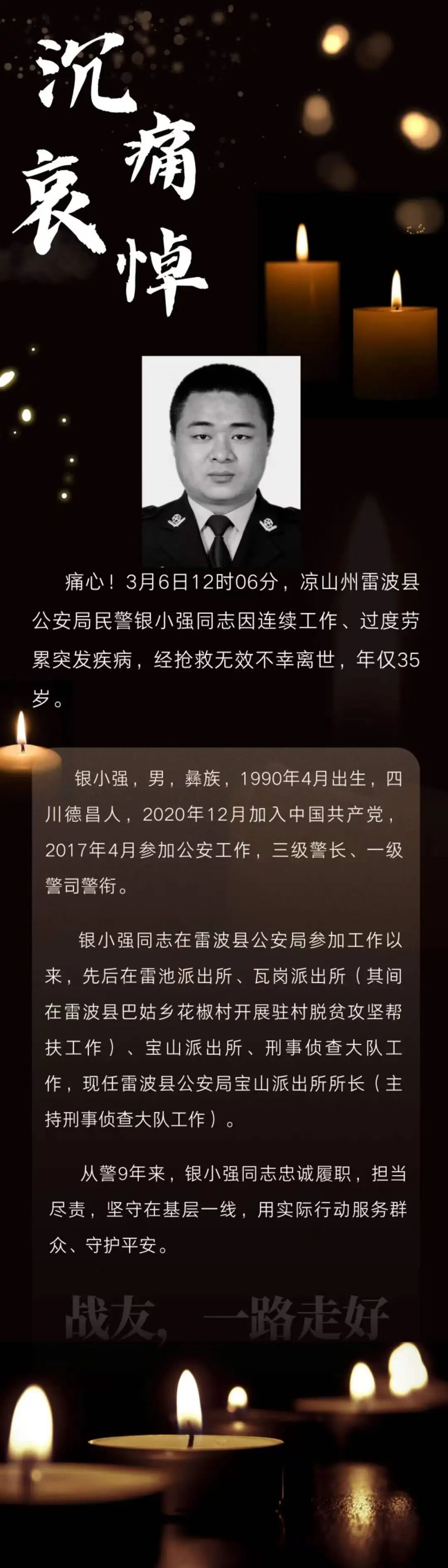 痛心!3月6日12时06分,凉山州雷波县公安局民警银小强同志因连续工作、过度劳累突发疾病,经抢救无效不幸离世,年仅35岁。这是川观新闻记者3月10日从省公安厅获悉的信息。