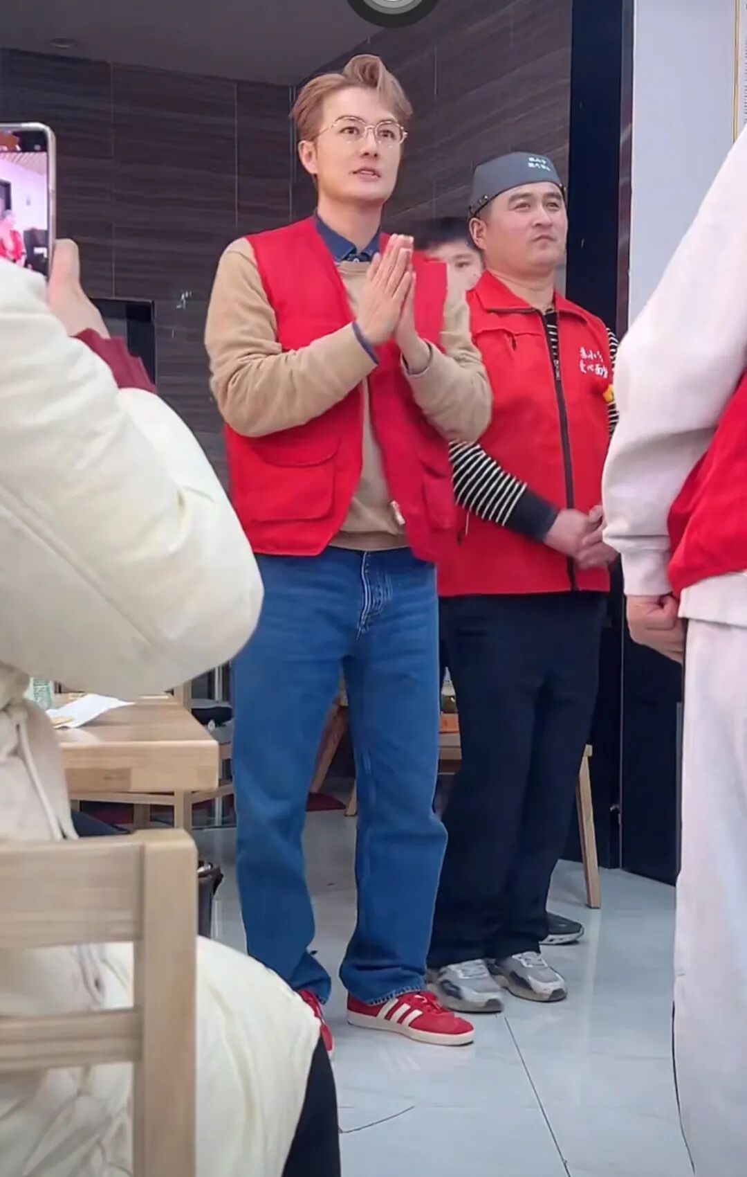3月10日,山东青岛,歌手吴克群来到残障人士张善领刚开张的面馆,现场帮忙招呼顾客。
