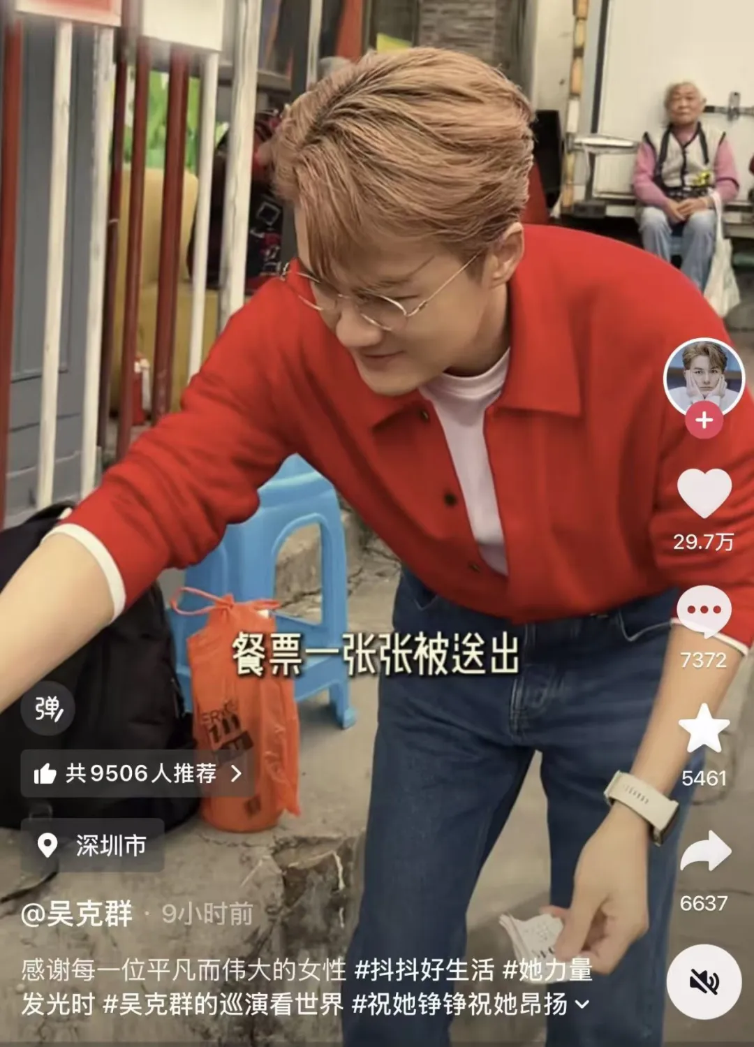 3月7日,知名歌手吴克群被拍到在深圳闹市一家爱心食堂做义工,运菜、洗菜、择菜、打扫卫生,吴克群将镜头聚焦在深圳的义工奶奶,组织义工奶奶们到深圳的旅游景点旅游。