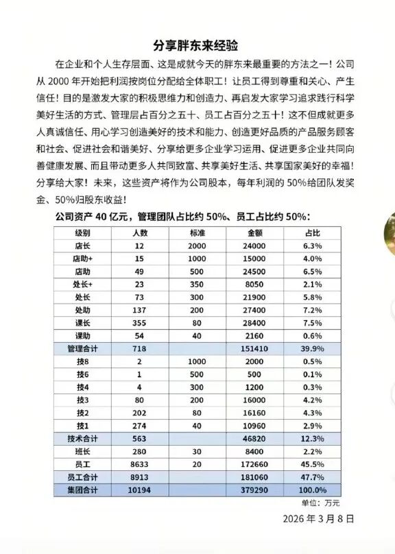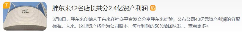 3月10日,话题“胖东来12名店长共分2.4亿资产利润”冲上热搜。