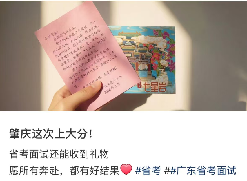 近日,广东省2026年度选调优秀大学毕业生和考试录用公务员肇庆考区面试举行。考试结束后,工作人员向考生免费赠送肇庆风景明信片和免费游览星湖旅游景区大礼包,邀请大家在考试结束后畅游国家5A级景区七星岩、鼎湖山。