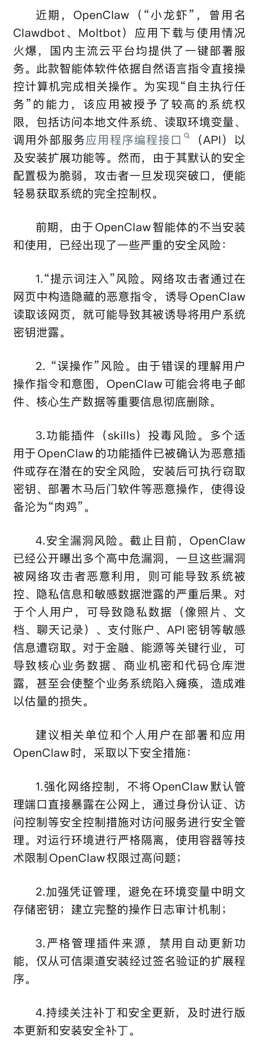 国家互联网应急中心3月10日发布《关于OpenClaw安全应用的风险提示》。