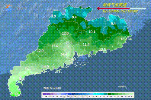 最低气温:粤北、珠三角北部和粤东市县9~13℃,雷州半岛16~20℃,其余大部分市县13~16℃。