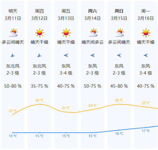 3月12日—16日以晴天间多云为主,天气干燥,气温小幅波动,其中3月12日夜间至3月14日东路弱冷空气影响,气温小幅下降,偏东风加大,沿海、高地和海区最大阵风7级。