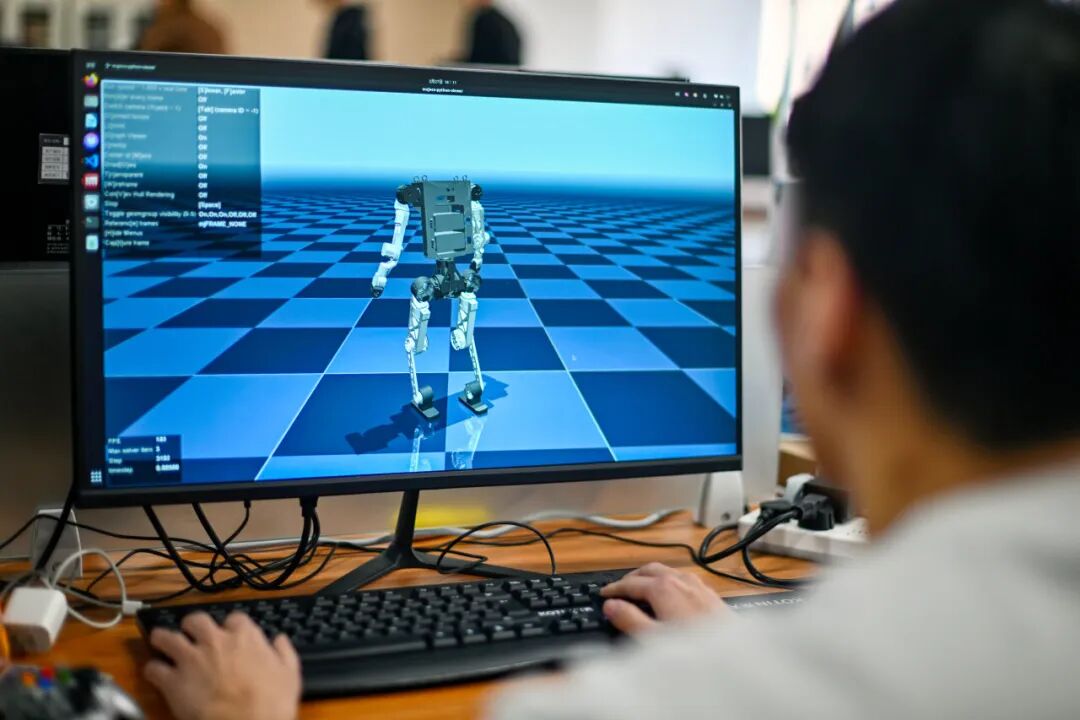 2月27日,在位于天津滨海高新区的天津木牛流马科技发展股份有限公司,工作人员对一款具身机器人进行仿真测试。赵子硕摄(新华社)