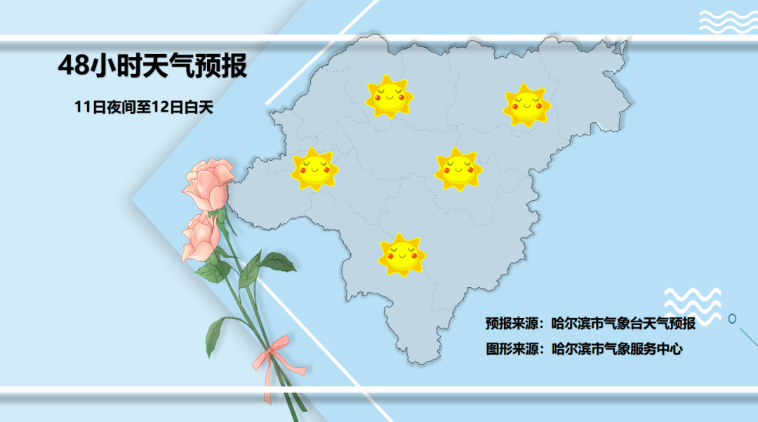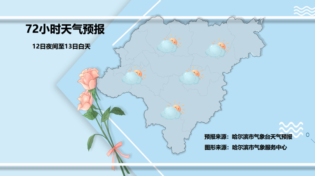 12日夜间至13日白天:全市晴转多云;东南风2~3级;最低气温通河、方正、依兰、延寿-11~-9℃,其他区域-8~-5℃,最高气温4~9℃。