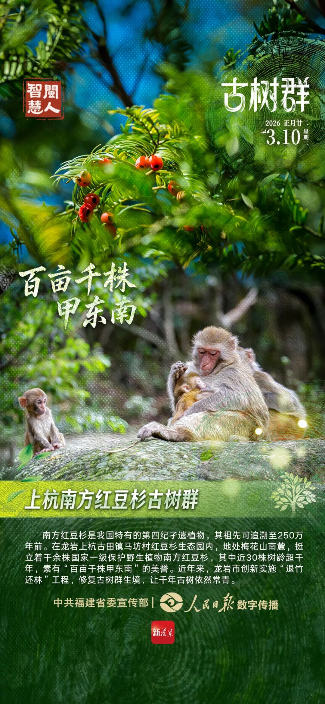 南方红豆杉是我国特有的第四纪孑遗植物,其祖先可追溯至250万年前。在龙岩上杭古田镇马坊村红豆杉生态园内,地处梅花山南麓,挺立着千余株国家一级保护野生植物南方红豆杉,其中近30株树龄超千年,素有“百亩千株甲东南”的美誉。近年来,龙岩市创新实施“退竹还林”工程,修复古树群生境,让千年古树依然常青。