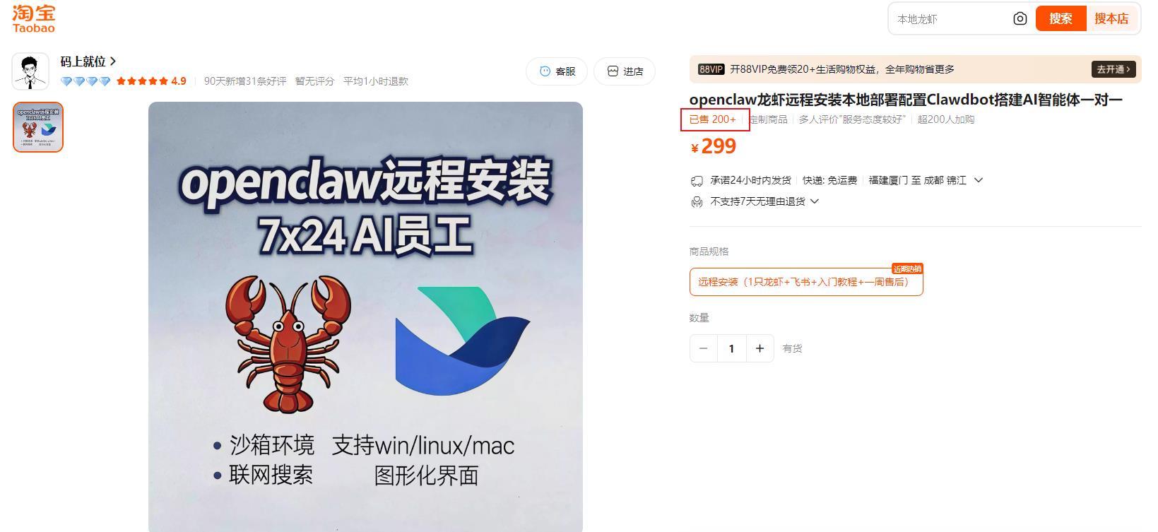 淘宝店铺“码上就位”店主表示:“3月9日才上架,仅一天时间,‘远程代装龙虾’就已爆卖200单,现在下单还需要排队。”该店铺除安装外,还提供售后“手把手教会”服务,目前收费299元,并表示“估计很快还会涨价。”