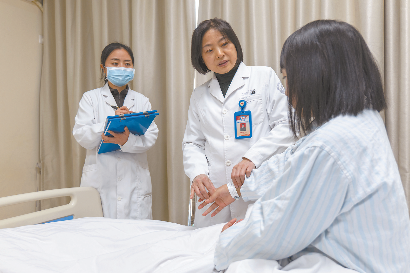刘德芳(中)指导年轻医生望闻问切。(王子冰 摄)