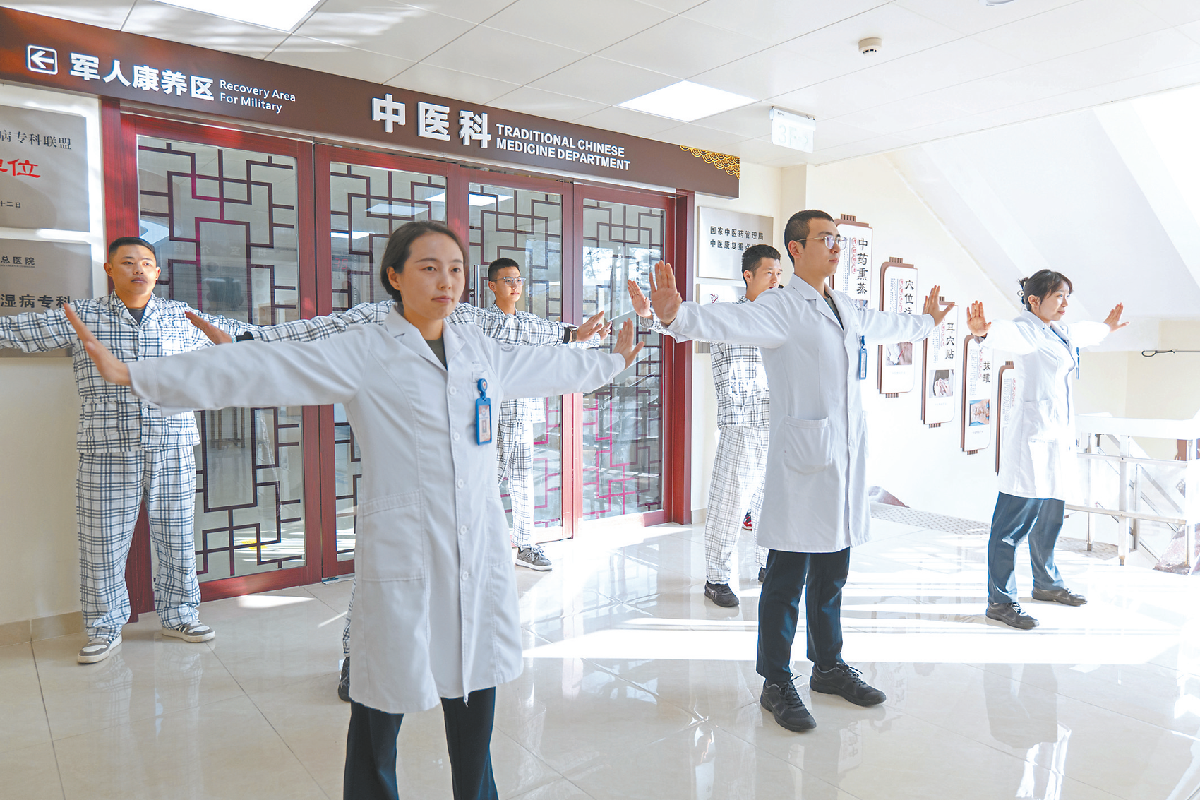 医护团队带领患者练习古法舒肝操。(王子冰 摄)