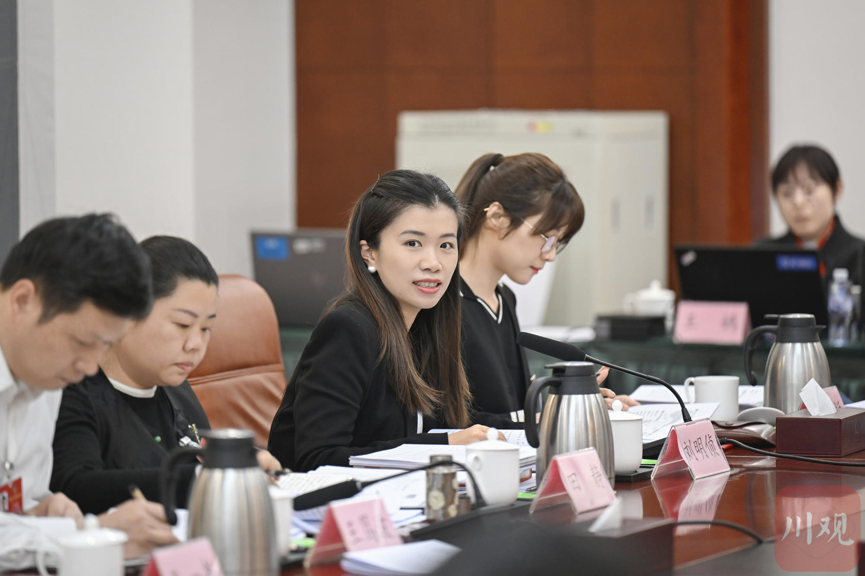 阿来委员(左二)在全国政协十四届四次会议小组会议上发言。