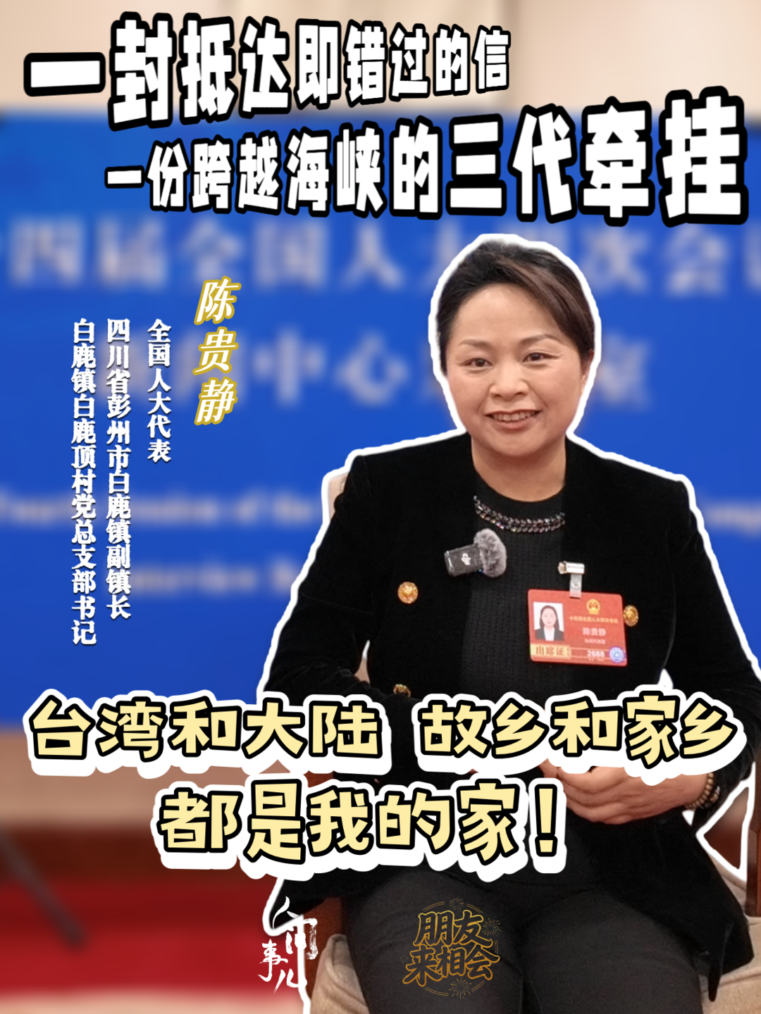 再后来,她成为白鹿顶村的村支书,被选举为全国人大代表,台湾省全国人大代表大多是在祖国大陆出生的台湾省籍同胞。在这里,她见到的世界越来越大,能做的事越来越多。从田间地头到人民大会堂,这位全国人大台湾省代表团的首位农民代表总说,台湾是她的故乡,四川是她的家乡。