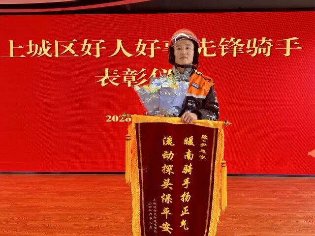 表彰会后,他把鲜花和锦旗放到了电瓶车后座的外卖箱里。因为昨天是休息日,他着急回去收拾屋子,把表扬信和奖金都落在了南星街道党群服务中心,工作人员联系他后他才折返回来。