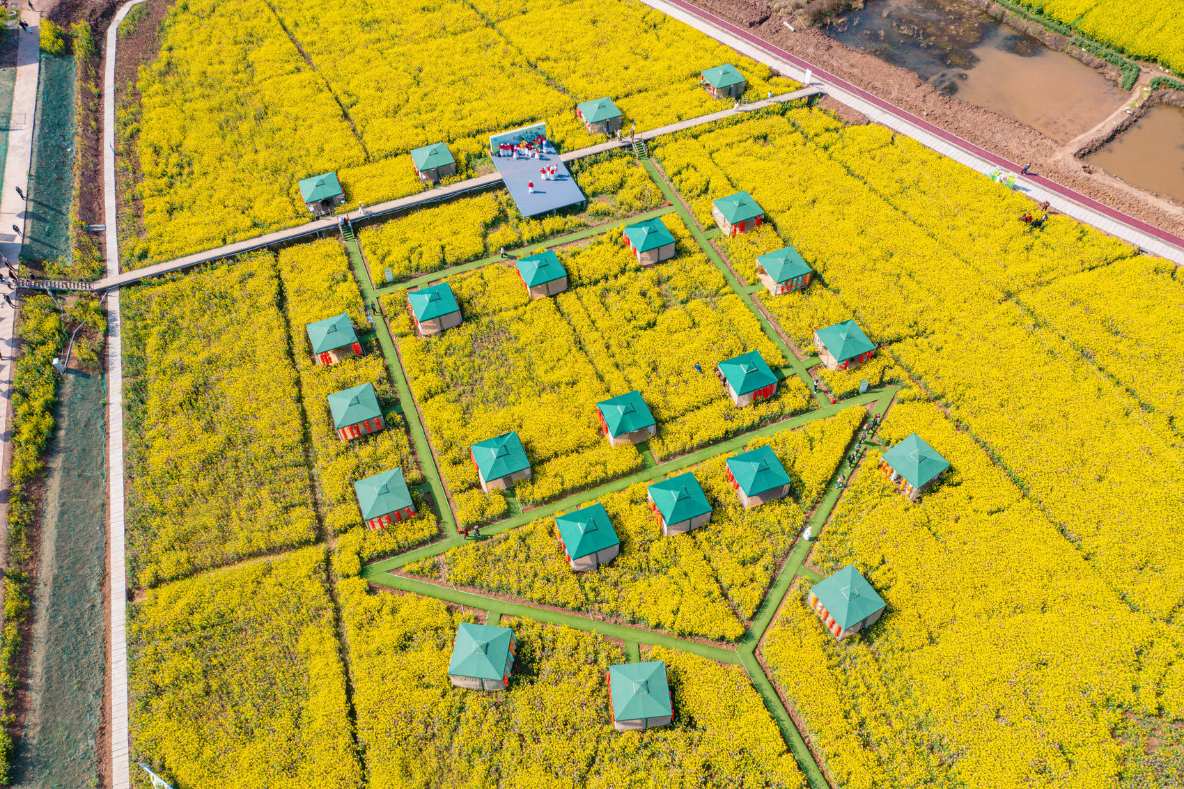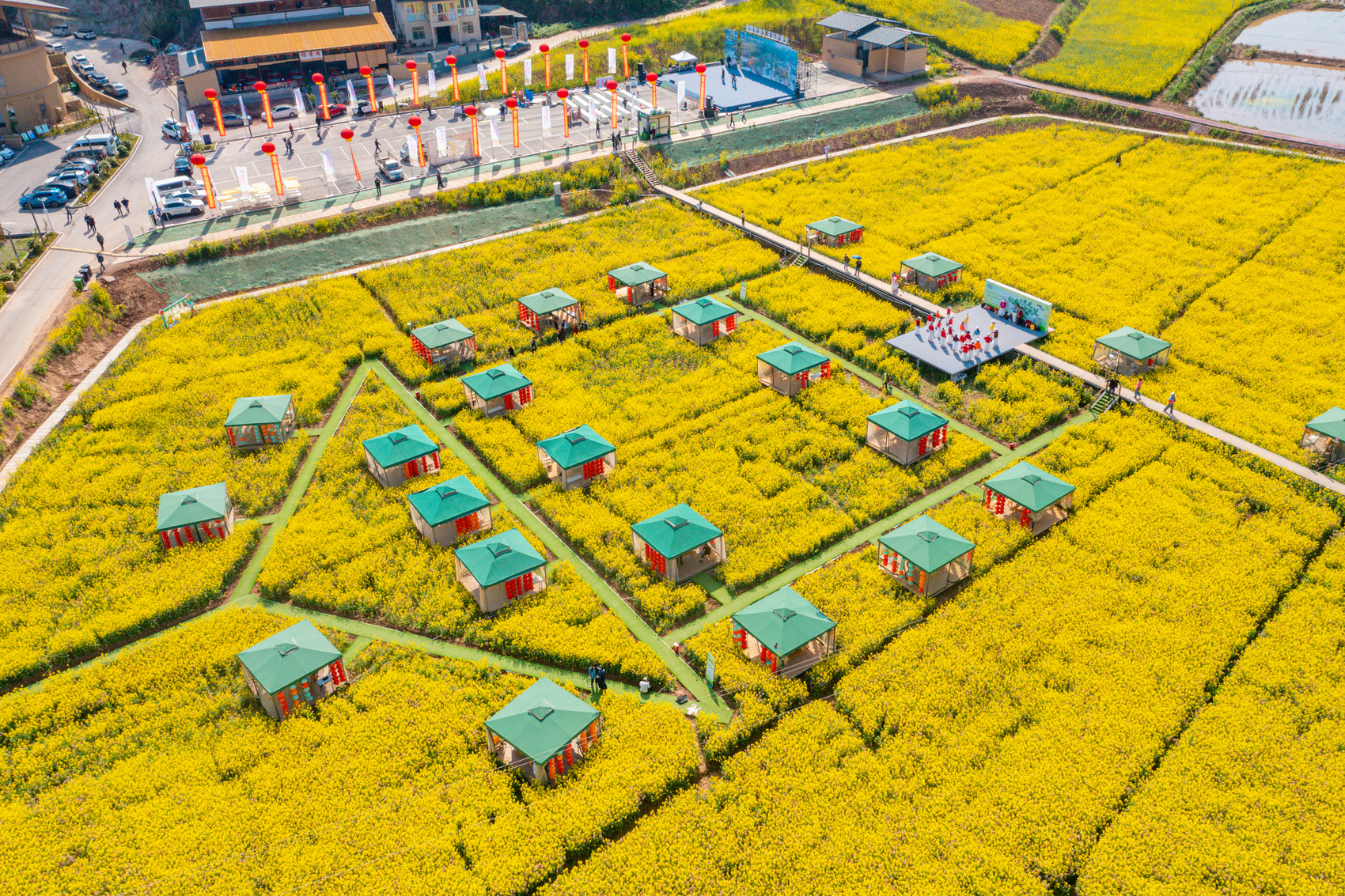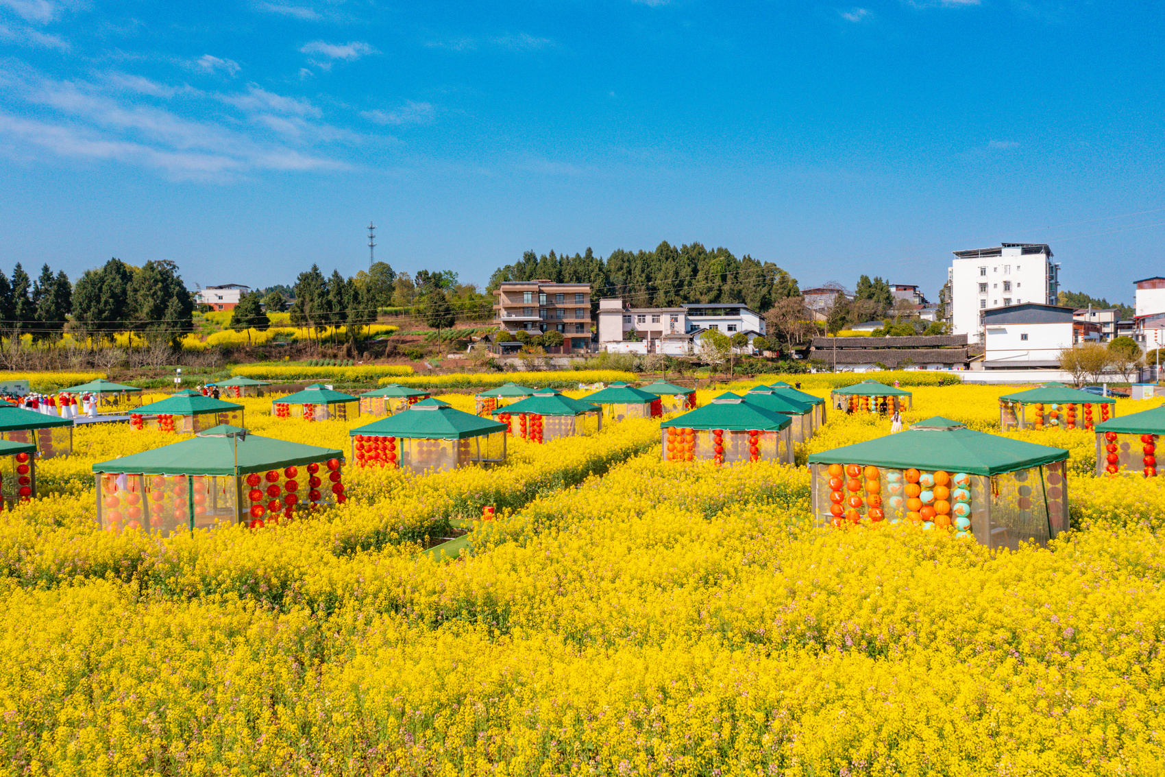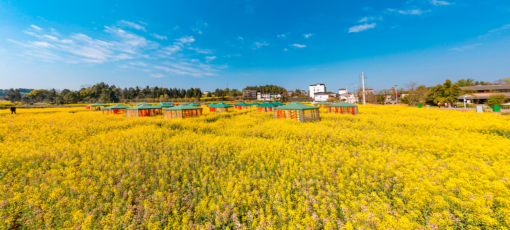 从空中俯瞰,千亩油菜花田金黄遍野,彩色油菜花点缀其间,宛如大地调色盘。游客们穿梭花海,拍照打卡,尽情享受春日浪漫。作为活动的天然主会场,这片花海不仅承载着乡村的美丽风光,更拉开了四川春季游玩的大幕。