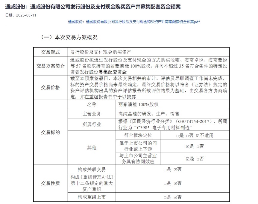因筹划通过发行股份及支付现金的方式,购买青海丽豪清能股份有限公司100%股权,通威股份(600438)从2月25日开始停牌,经过十余日的等待,2026年3月10日公司召开第九届董事会第七次会议审议了相关议案,并申请股票、可转债及可转债转股将于2026年3月11日开市起复牌。