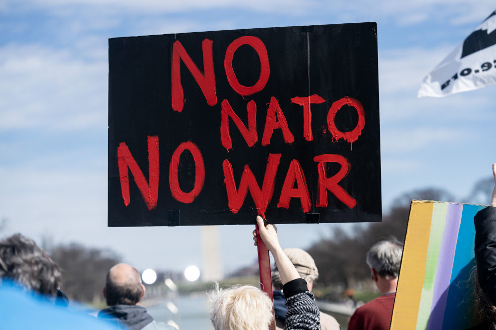 2023年2月19日,在美国首都华盛顿,一名抗议者手举“无北约,无战争”标语。新华社记者 刘杰 摄