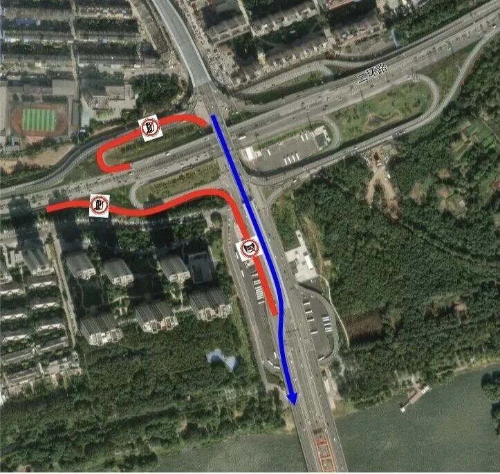 桥下地面道路受桥梁高度限制,为保障通行安全和畅通,除北向西辅路右转通道外,各方向辅路入口处一律限高2.2米,即只准小型客车通行,货车等超高车辆需提前绕行。同时,为保障桥梁施工期间的安全,需根据施工进度分期关闭桥下部分辅路或限制进入车辆的行驶方向。