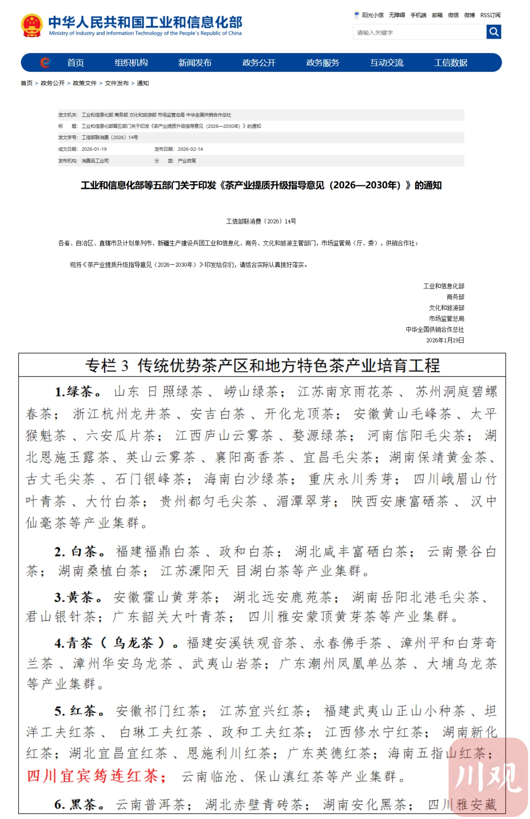 3月11日,川观新闻获悉,工信部等五部门于近日联合印发《茶产业提质升级指导意见(2026—2030年)》,筠连红茶纳入全国红茶产业集群培育重点,成为四川省唯一入选的红茶品类。