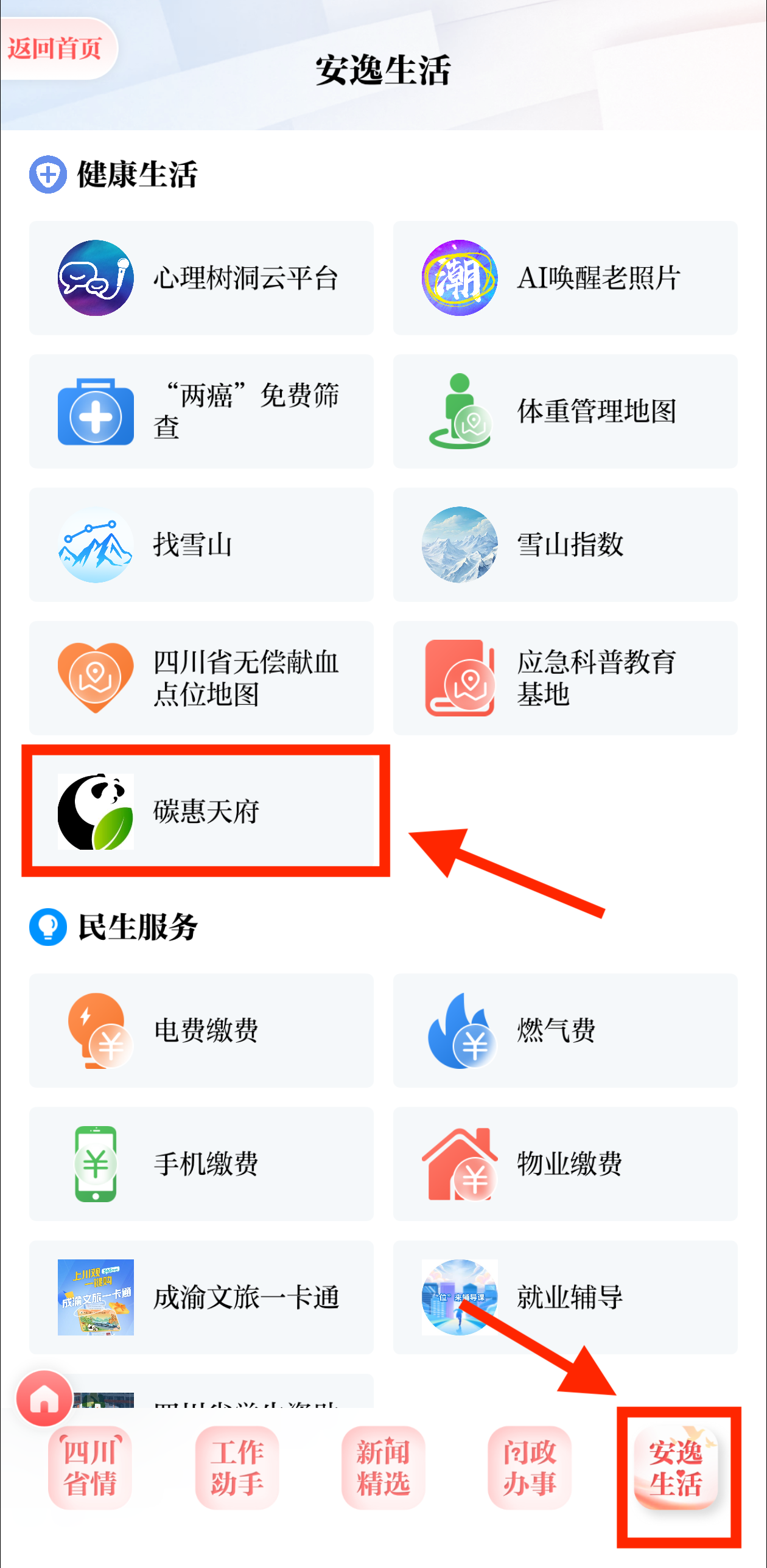2.进入“健康生活”板块,找到“碳惠天府”入口;