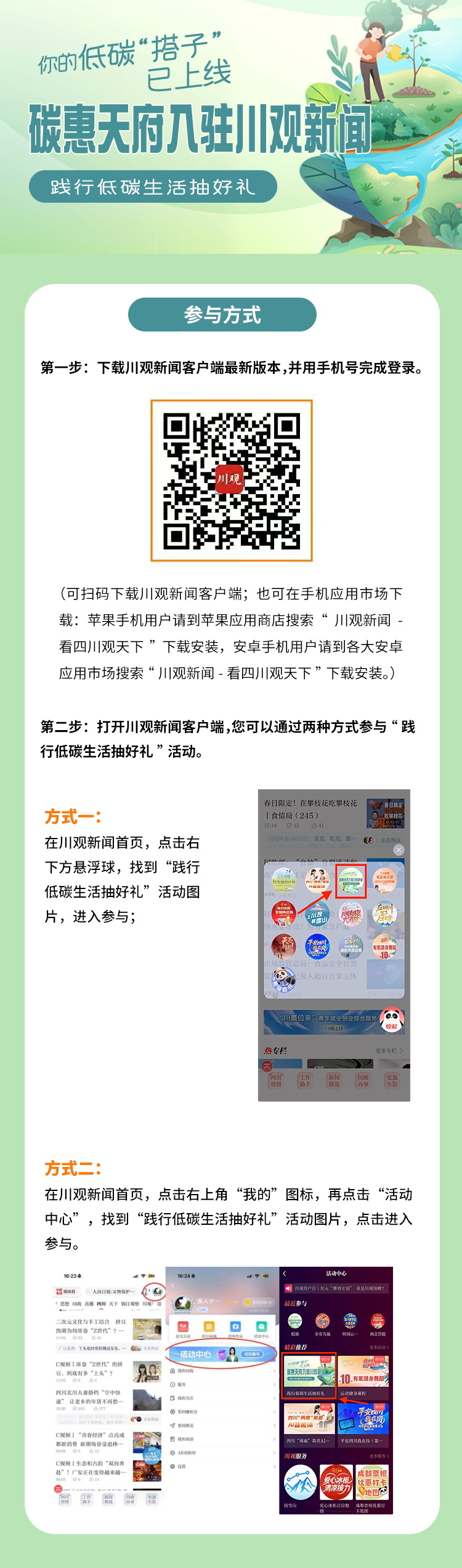 哇噻,这个植树节,低碳生活触手可及!川观新闻携手碳惠天府,让健康出行与环保行动完美结合。三步轻松进入低碳模式,步行5000步还能抽环保大礼包,奖品实用又走心。快来解锁你的绿色积分,用行动守护蓉城的绿水青山吧!