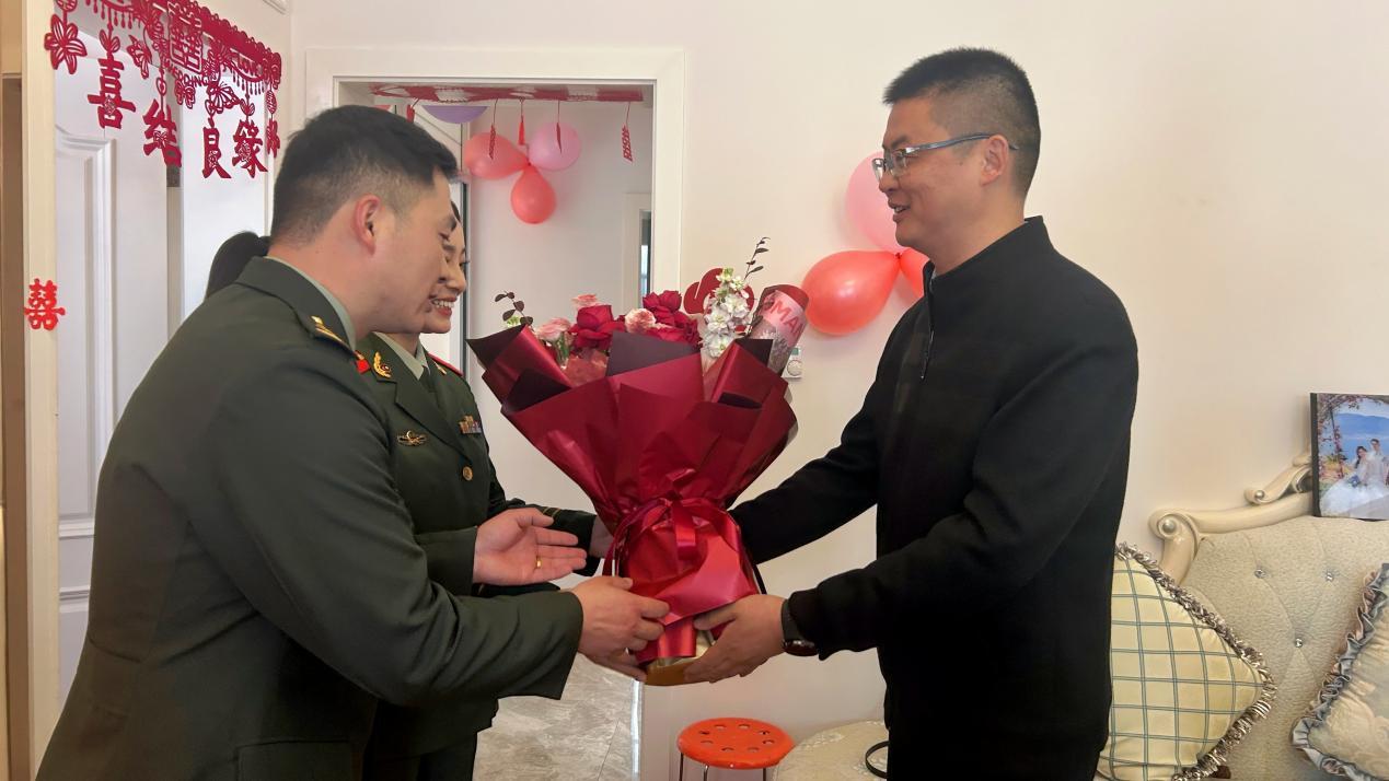 上午9点45分,车队抵达三江街道新郎家中。在举行完简洁庄重的仪式后,两位新人换上了承载着青春与荣耀的军装。军装加身的那一刻,婚礼现场的氛围变得格外庄重。