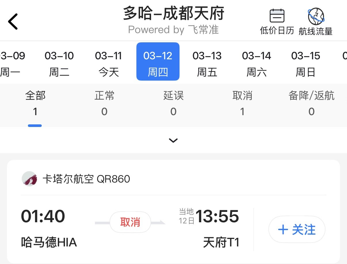 针对四川本地旅客关注的成都直飞航线,记者查询卡塔尔航空官网发现,原定于12日、14日执飞的多哈—成都天府航班暂未查询到相关信息。飞常准平台也显示这两日卡塔尔航空QR860航班取消。