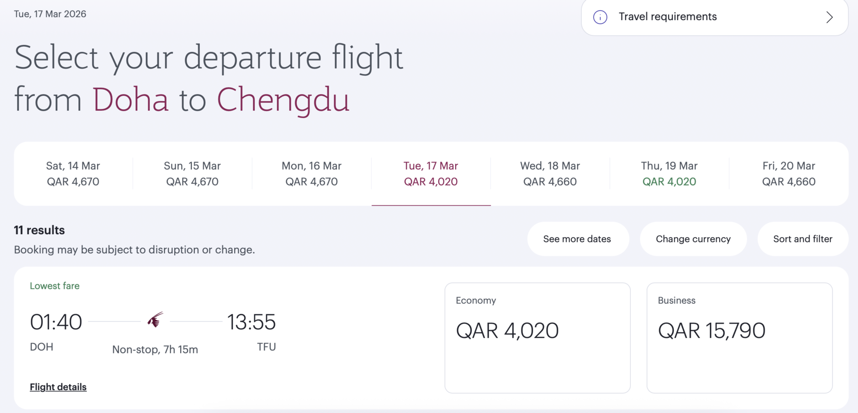 不过,目前卡塔尔航空官网可以订购17日及后续航班。该航班当地时间01:40起飞,北京时间13:55到达成都,全程飞行7小时15分。目前去哪儿等购票平台,也可以购买17日该航班机票。