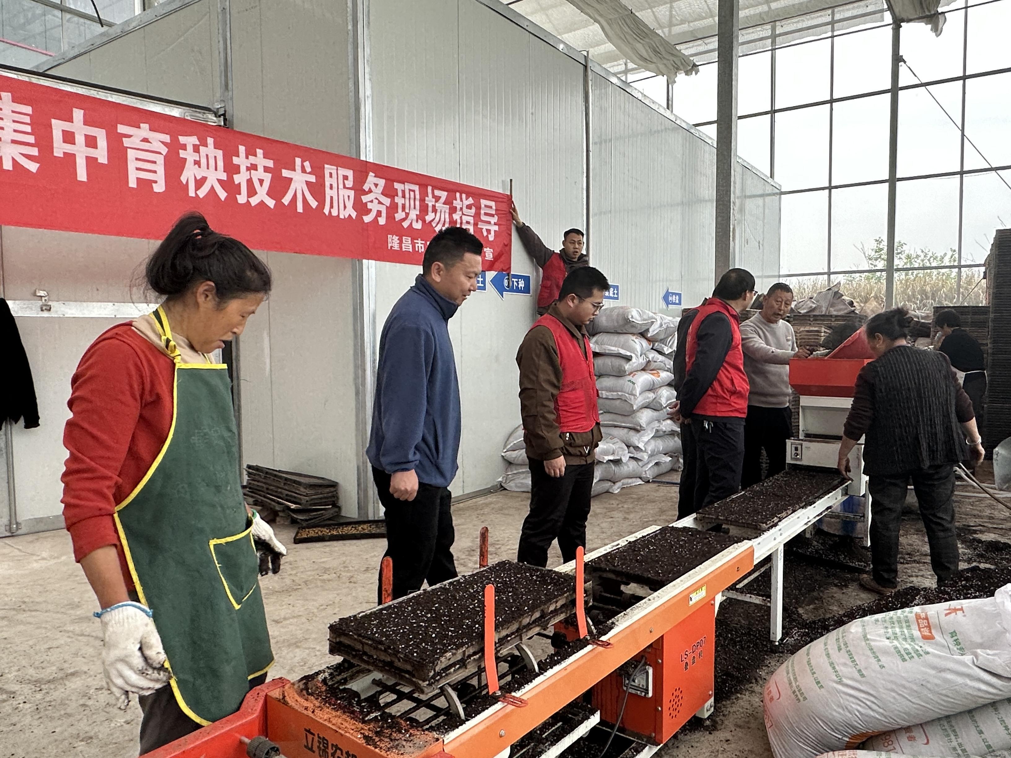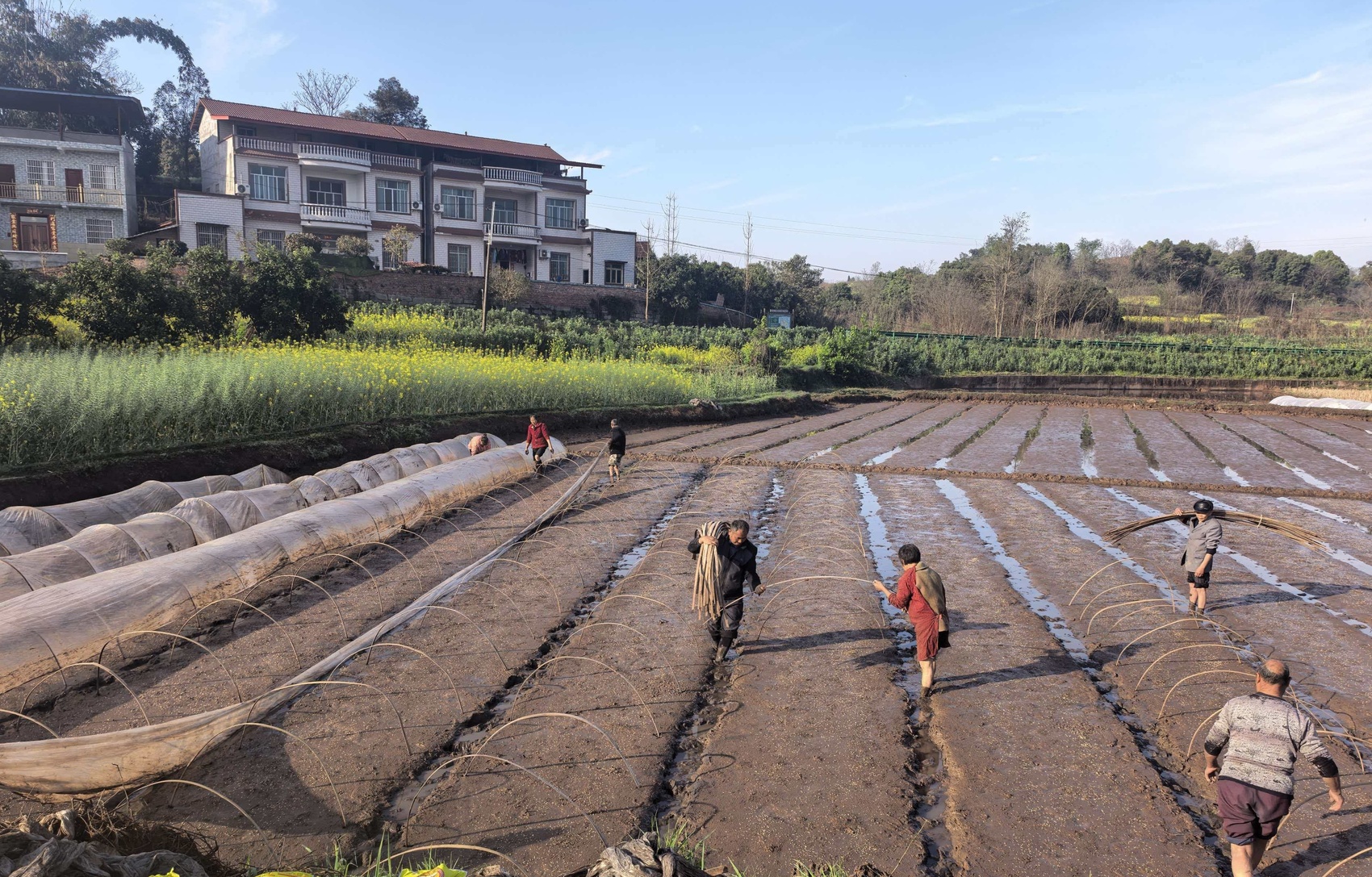 3月11日,正值春耕时节,隆昌市胡家镇班竹村,连片的育秧田平整如镜,20来个村民卷着裤脚在水田里忙碌,拎着谷种袋均匀抛撒。