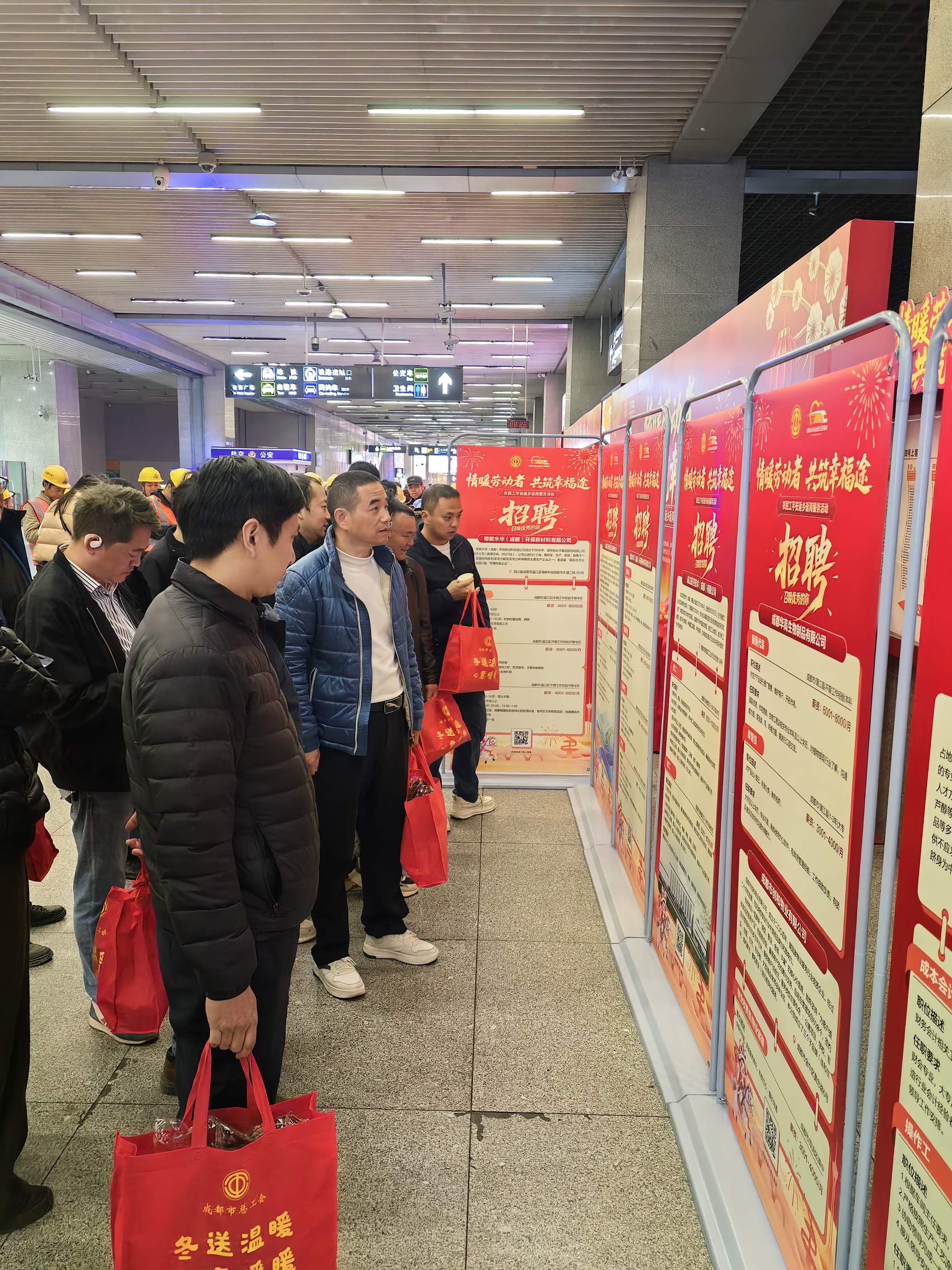 活动现场热闹而有序。由成都市总工会组织各区(市)县总工会,联合多家企业及工会就业平台设立的招聘专区格外醒目。制造、服务、建筑等领域的招聘信息清晰地列在展板上,吸引了大量旅客驻足咨询。工作人员耐心解答着岗位要求、薪资待遇、工作地点等每一个问题,协助务工人员与企业快速对接。