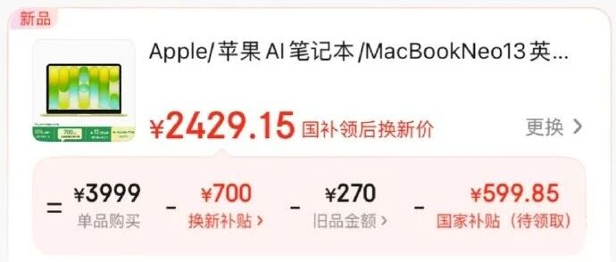 3月11日,苹果史上最便宜的笔记本电脑MacBook Neo正式开售,官方起售价为4599元。极目新闻记者注意到,在叠加国补后,其价格为3909.2元,目前,京东平台上已有超6万人预约。