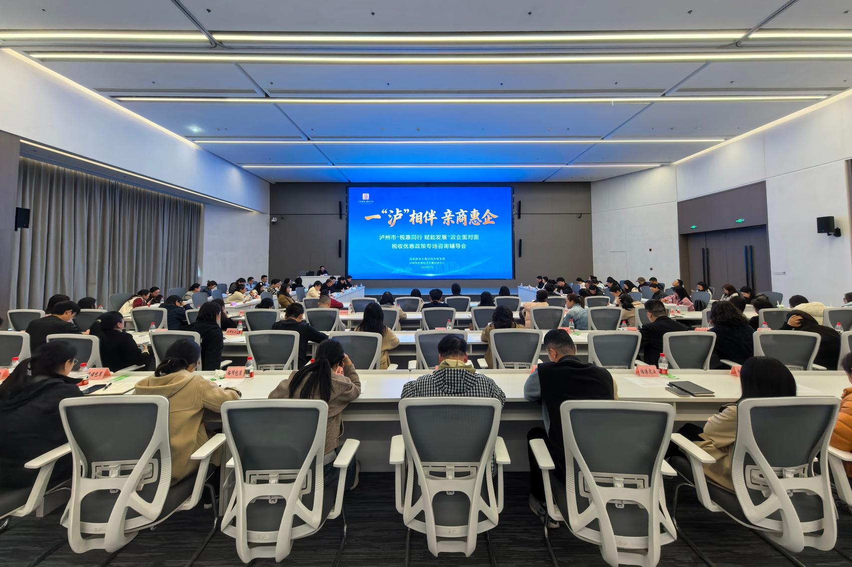 这是由泸州市民营经济发展促进中心、国家税务总局泸州市税务局共同主办的“税惠同行 赋能发展”税收政策宣辅专场活动现场。本次专场辅导主要面向制造业、生产性服务业及高科技企业,聚焦增值税加计抵减、企业所得税研发费用加计扣除两大核心政策,开展精准解读、实操辅导、现场答疑,确保税收政策直达快享、应享尽享。