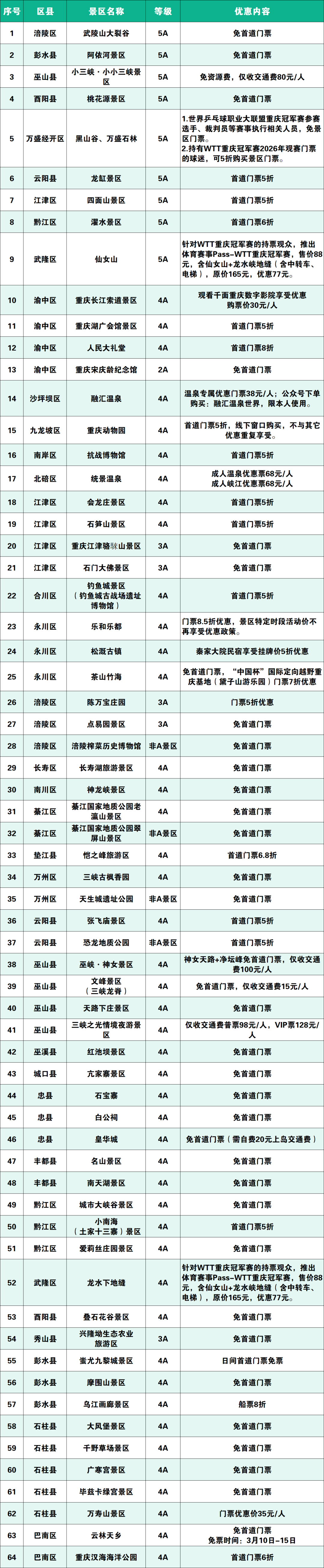 万盛黑山谷、万盛石林、云阳龙缸、江津四面山、合川钓鱼城、长江索道、重庆动物园等28家景区,对2026年WTT重庆冠军赛观众推出不同程度折扣或套票。