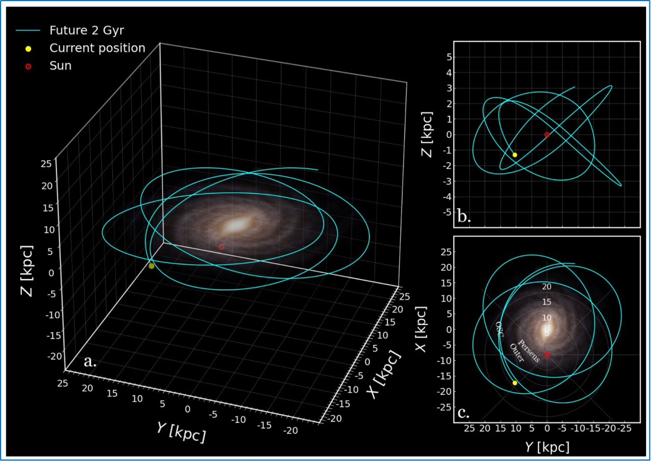 “峨眉”星团在银河系外围的三维轨道。