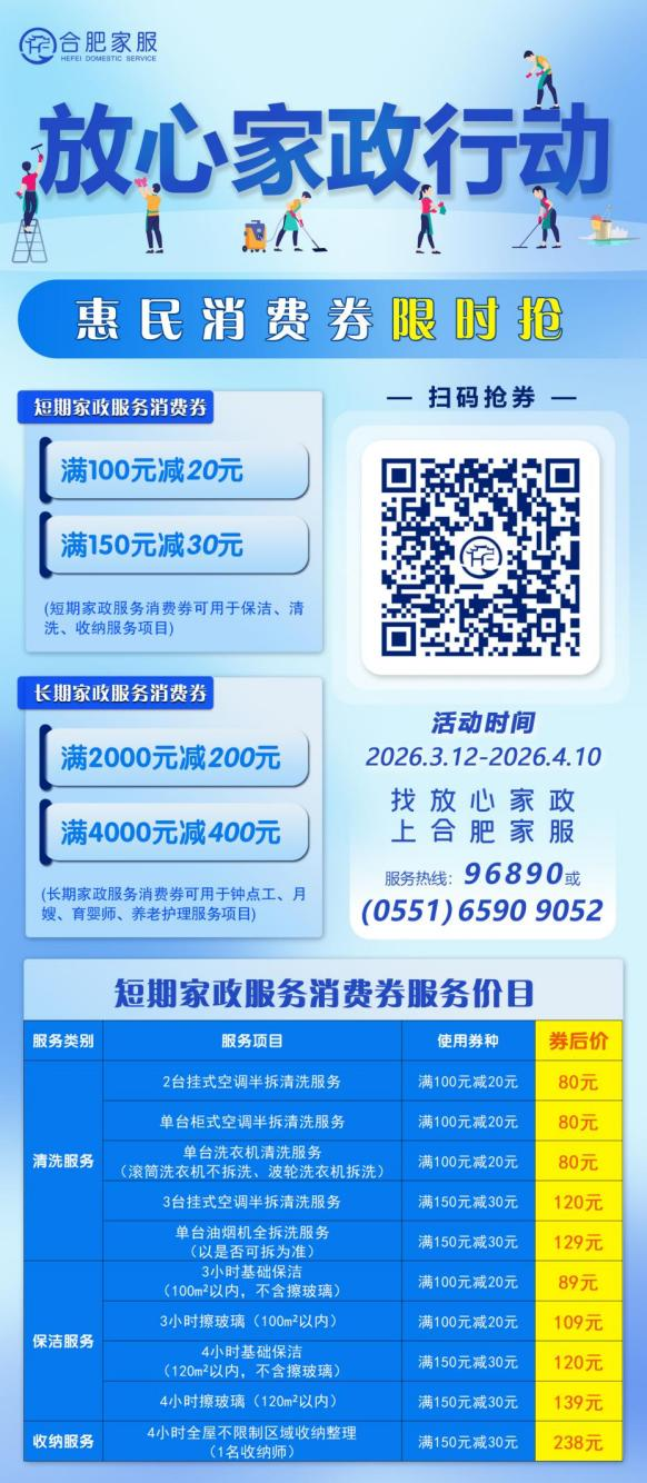 市民可关注“合肥家服”微信公众号,后台回复关键词“消费券”,点击链接领取。或登录“皖事通”APP,首页搜索“家政服务”,进入合肥家服专区领取。