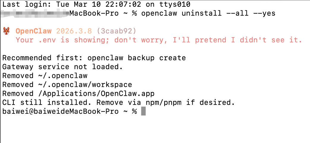 上面的指令跑完后,你的电脑里就只剩下OpenClaw的外壳(CLI 工具)了。如果你想把它也彻底送走,再执行一行——代码块:npm uninstall -g openclaw。