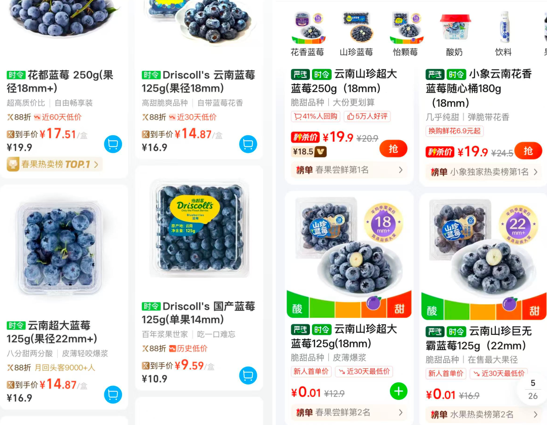 蓝莓降价并非个例。记者在多家电商平台看到,今年蓝莓上市果径更大、价格更便宜,主流果径18毫米以上的云南蓝莓价格为40元/500克。叮咚买菜统计显示,今年上架了多款不同规格的云南蓝莓,其中以平台售卖的云南蓝莓(规格为18mm,250g)这一产品为例,截至3月10日,今年蓝莓销售价格比去同期售价下降约23%。