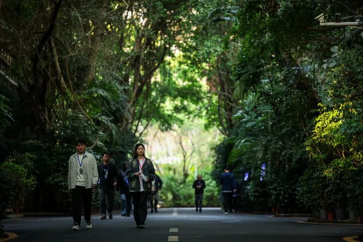 2025年4月2日,下班的员工走在冠旭电子深圳总部的园区里。新华社记者毛思倩摄