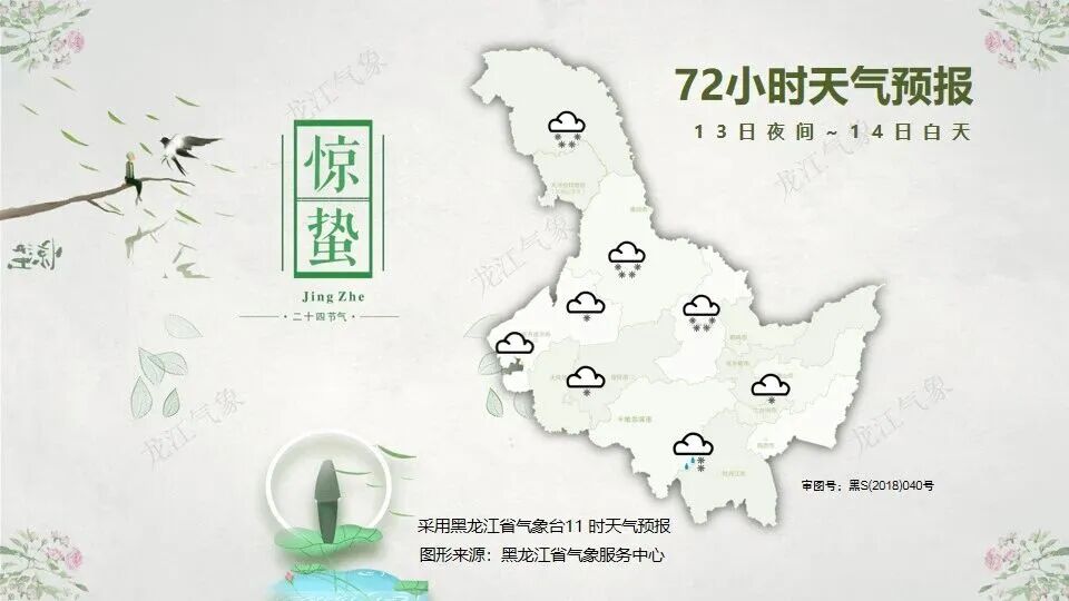 13日夜间到14日白天:大兴安岭、黑河、伊春阴有小到中雪,其中大兴安岭东部局地大雪,齐齐哈尔南部多云,其他地区多云有阵雪或雨夹雪。