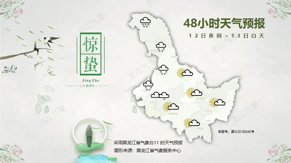 12日夜间到13日白天:大兴安岭北部阴有中到大雪,其中大兴安岭西北部局地暴雪,大兴安岭南部、黑河西部、齐齐哈尔西部阴有小到中雪,齐齐哈尔东部、大庆、绥化西部多云转阵雪或雨夹雪,其他地区晴转多云。