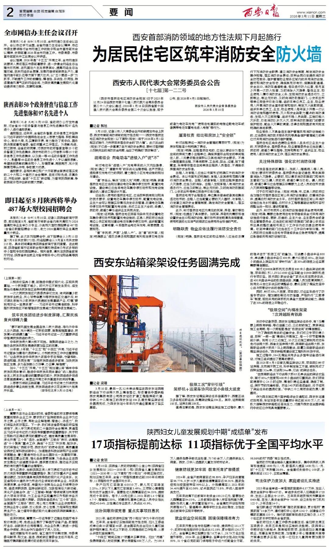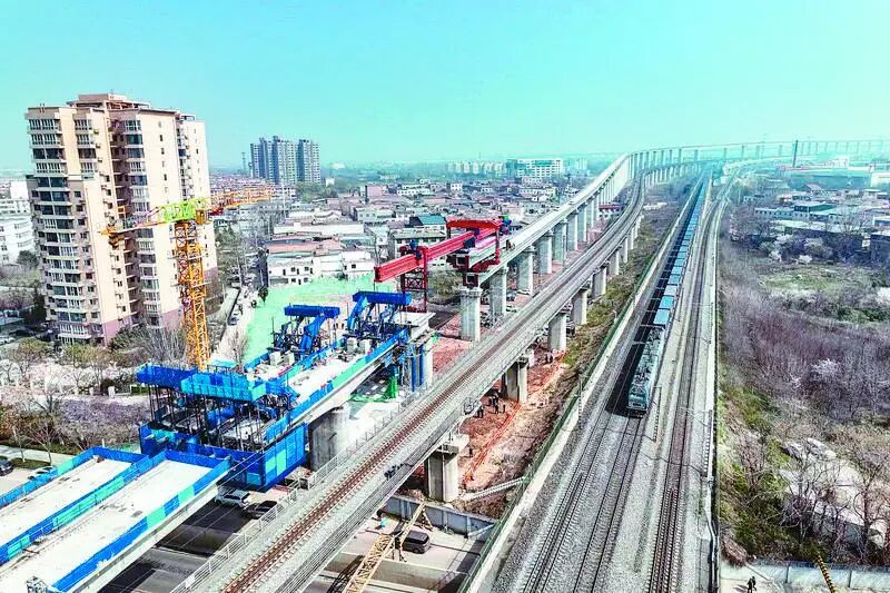 3月10日,最后一孔32米单线箱梁在西安东站西南联络线下行线特大桥上精准落位,标志着西安东站394孔简支箱梁架设任务圆满完成,为西安东站今年年内开通运营奠定了坚实基础。图为项目建设现场。(受访单位供图)