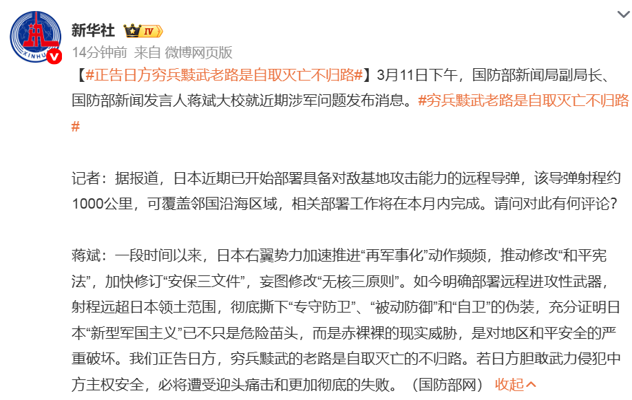 蒋斌:一段时间以来,日本右翼势力加速推进“再军事化”动作频频,推动修改“和平宪法”,加快修订“安保三文件”,妄图修改“无核三原则”。如今明确部署远程进攻性武器,射程远超日本领土范围,彻底撕下“专守防卫”、“被动防御”和“自卫”的伪装,充分证明日本“新型军国主义”已不只是危险苗头,而是赤裸裸的现实威胁,是对地区和平安全的严重破坏。我们正告日方,穷兵黩武的老路是自取灭亡的不归路。若日方胆敢武力侵犯中方主权安全,必将遭受迎头痛击和更加彻底的失败。