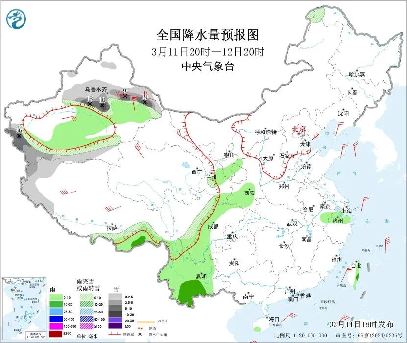 3月11日20时至12日20时,新疆北疆和南疆西部山区、西藏西部和东南部、川西高原北部等地部分地区有小雪或雨夹雪,其中,新疆沿天山地区和南疆盆地西部山区、西藏西部等地部分地区有中到大雪,局地有暴雪(10~19毫米)。新疆南疆盆地、西藏东南部、西北地区东部、西南地区东部和南部、浙江北部、安徽东南部、海南岛、台湾岛等地部分地区有小到中雨。
