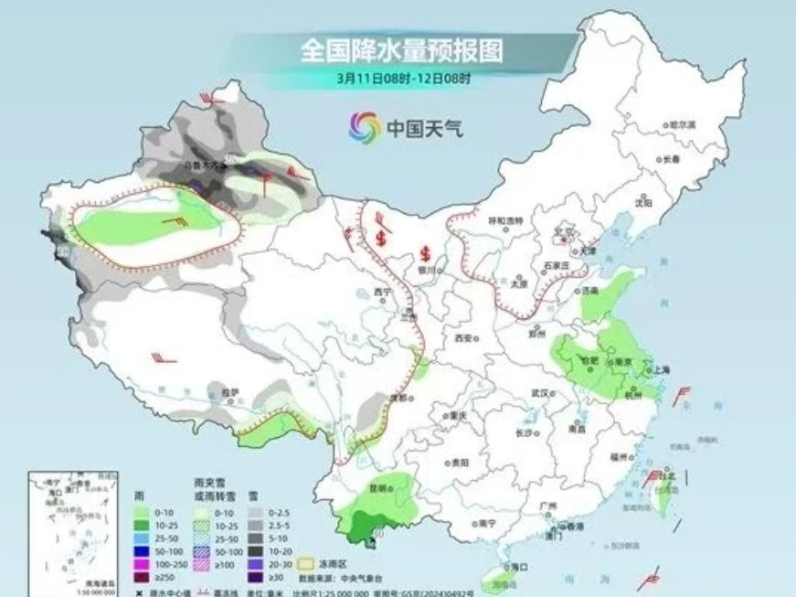据中央气象台预计,今天新疆北部和南疆山区、西藏西北部和东部等地部分地区有小到中雪或雨夹雪,其中,新疆沿天山地区和南疆西部山区等地部分地区有大到暴雪,局地大暴雪。新疆南疆盆地、西藏东南部、山东中东部、苏皖大部、浙江北部、云南中东部、海南岛等地部分地区有小到中雨,其中,云南西南部等地部分地区有大雨。