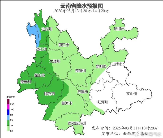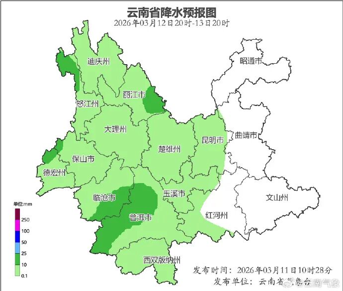昆明市、玉溪市、红河州西部、普洱市、西双版纳州、临沧市、德宏州、保山市、大理州、丽江市、迪庆州、怒江州阴天间多云有小雨局部中雨,其他地区多云间晴。